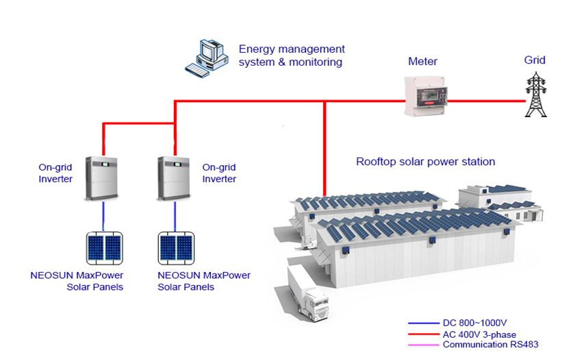 Сетевая СЭС состоит из солнечных батарей и инвертора, а также системы креплений. Принцип работы такой станции состоит в преобразовании солнечного света в электричество и его отдаче в сеть предприятия. В случае если электроэнергии от солнечных батарей не хватает, то вся недостающая часть добирается из внешней сети. Сгенерированнные излишки электроэнергии могут отдаваться во внешнюю сеть.